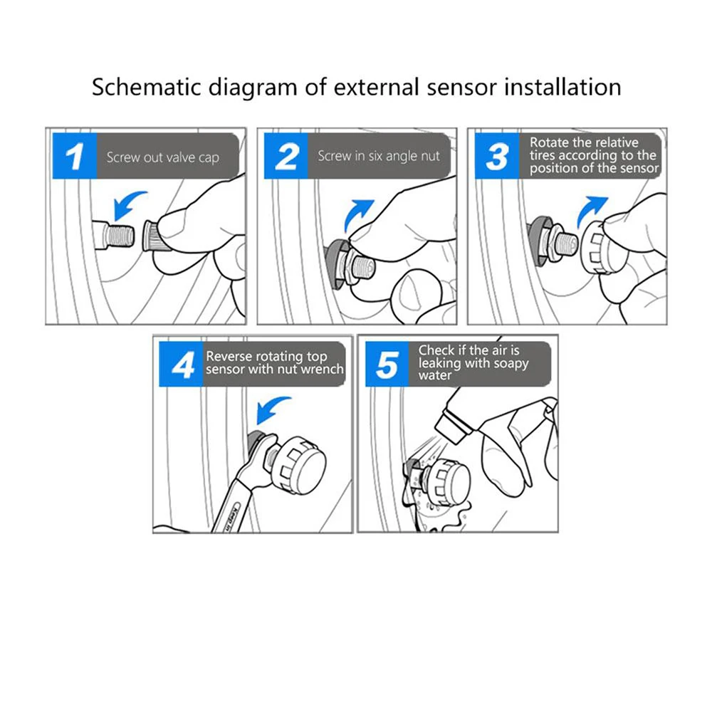 - Easy Setup: You can set up in 3 easy steps in just 10 minutes. 1. Remove tire valve caps, put in anti-theft screws;2. Install outer sensor on tire valve in order; 3. Hold the sensor, tighten anti-theft screw."