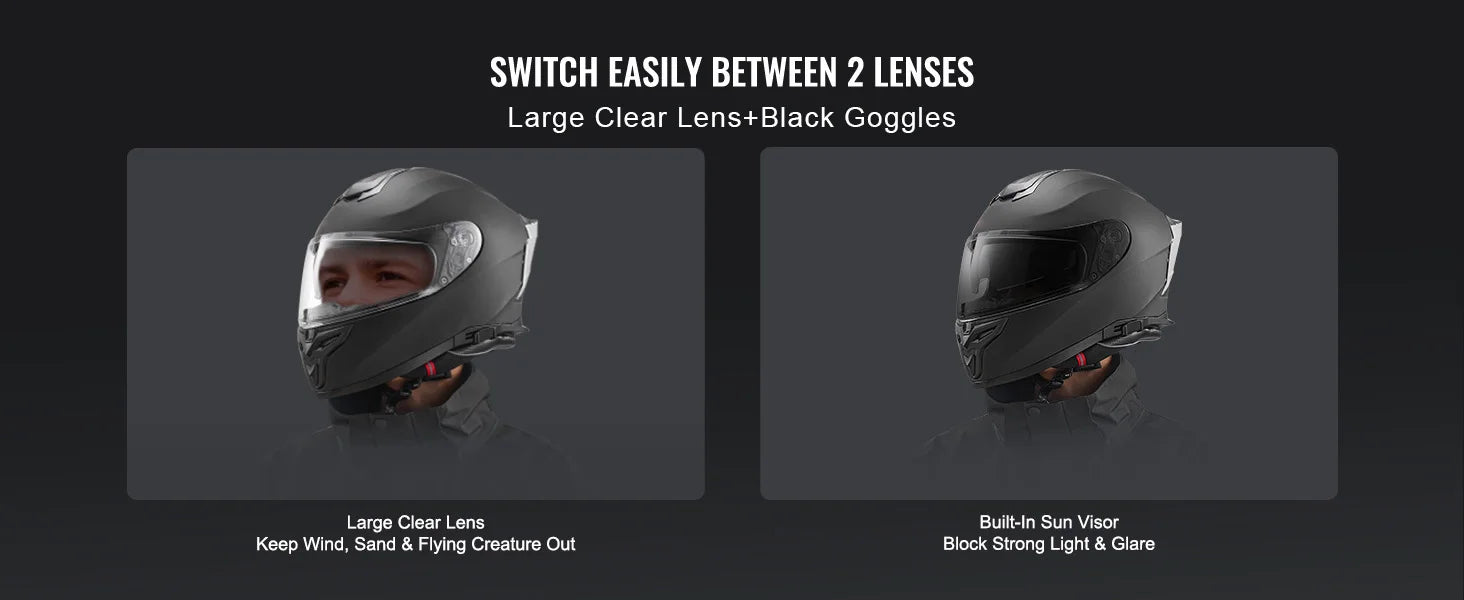 Built-in Sunshade Lens: The motorcycle helmet is equipped with large clear lens to block the wind while maintaining a high definition, minimizing the probability of accident. The built-in dark tea lens blocks glare and dazzle and avoid visual fatigue.